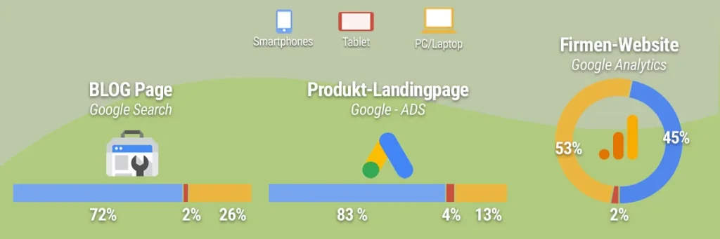Die Statistiken in der Grafik stammen von unseren eigenen Portalen und wurden von Kundenwebsites abgeleitet die zwischen 2000 – 6000 Klicks im Monat generieren. Ausnahme die Blog-Page, hier wurde Google Search Console gefragt über welche Geräte die Suchanfragen stammen, für die unsere Website ausgespielt wurde.